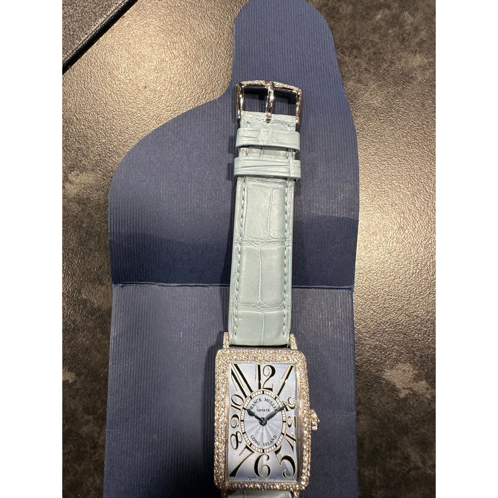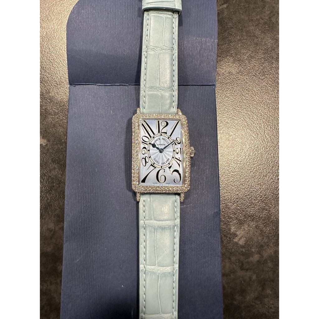 This circa 2008 Franck Muller Long Island 25mm features a blue guilloche dial with applied arabic numbers, it is concealed behind a sapphire crystal, which is surrounded by a diamond set bezel. It also feautures an 18ct white gold tang buckle on a leather strap. The House of Franck Muller opened in 1991, and his ultra complicated timepieces instantly became famous in Europe and the United States. Today, his factory, which is also the headquarters of Franck Muller, produces a limited number of watches for private clientele. Franck Muller's collections include a variety of designs and price ranges.This watch has been checked against technical records to guarantee authenticity and clean history.